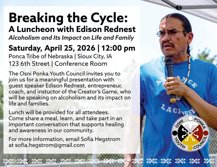The Osni Ponka Youth Council invites you to join us for a meaningful presentation with guest speaker Edison Rednest, entrepreneur, coach, and instuctor of the Creator’s Game, who will be speaking on alcoholism and its impact on life and families. Lunch will be provided for all attendees.