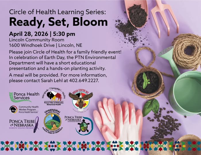 Please join Circle of Health for a family friendly event! In celebration of Earth Day, the PTN Environmental Department will have a short educational presentation and a hands-on planting activity. A meal will be provided. For more information, please contact Sarah Lehl at 402.649.2227.