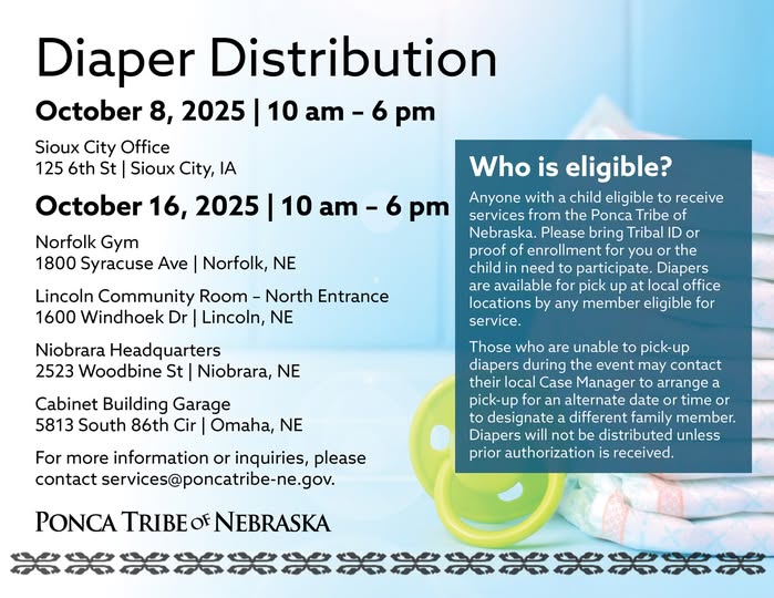 Please bring Tribal ID or proof of enrollment for you or the child in need to participate. Diapers are available for pick up at local office locations by any member eligible for service.