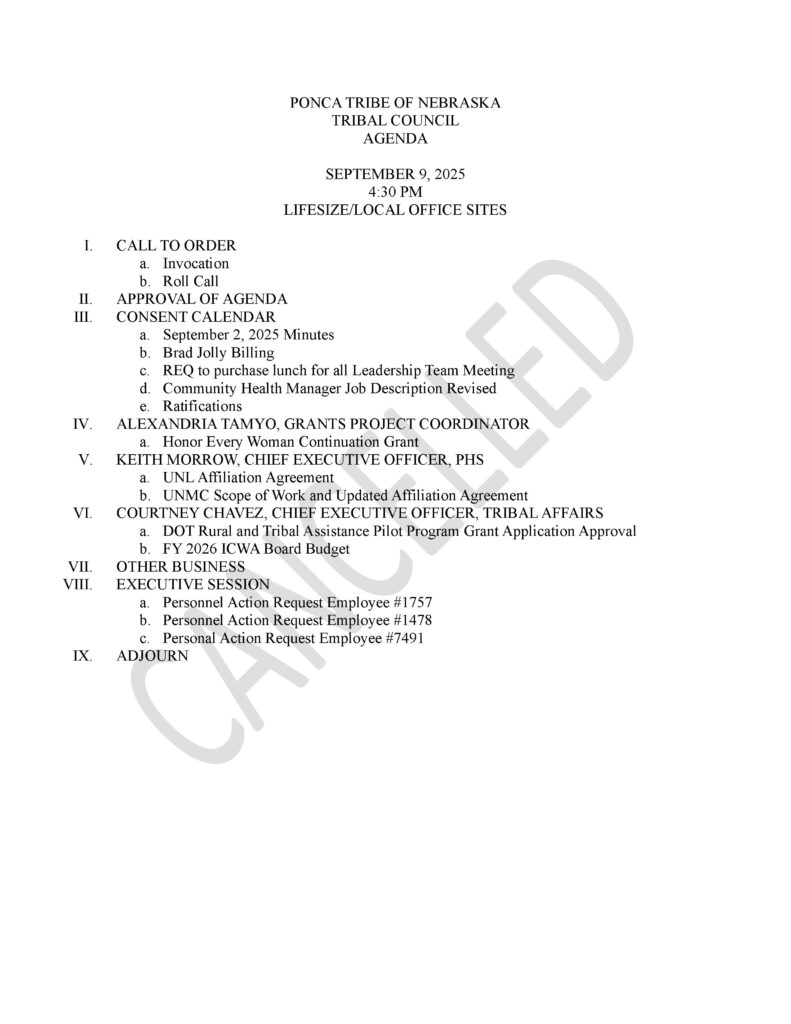 Tribal Council Meeting Cancelled for September 9th Post author:poncatribeadmin Post published:September 9, 2025 Post category:News The Tribal Council Meeting for today, September 9th has been cancelled. We apologize for the inconvenience.